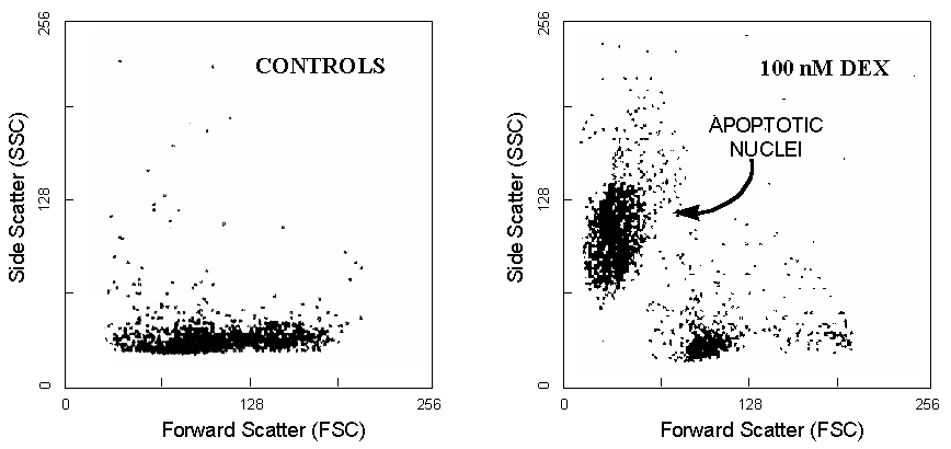 In later stages of apoptosis, furthermore, the intensity of both FSC and SSC decreases due to the emerging secondary necrosis. Therefore, the light-scanner changes are not very specific to apoptosis or necrosis, and light-scanner based methods require accurate controls for eliminating mechanically broken cells, and nuclear debris. This is not a main problem when thymocyte nuclei or T-cells cultured in suspension are analyzed, but is a critical point with cells of myeloid origin or adherent cultured cells.