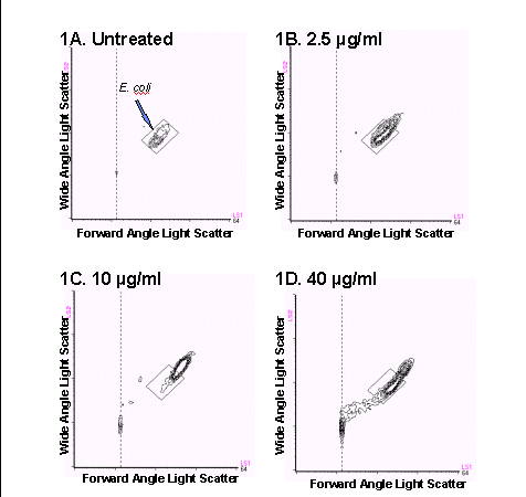 Figures 2A-D show ampicillin-treated E. coli stained with the FAST-2 kit. Live, untreated E. coli stain predominantly with Reagent B and are located in quadrant A (94.7%)(Figure 2A). Ampicillin-treated E. coli exhibited four populations: a quadrant A population, positive for Reagent B, negative for Reagent A, assumed to be live cells, a quadrant B population, positive for both Reagent A and Reagent B, assumed to be dying cells, and a quadrant D population, negative for Reagent B, positive for Reagent A, assumed to be dead, intact cells. Finally, quadrant C events, negative for both stains, were cells which did not exhibit fluorescence above background levels. As the ampicillin concentration was increased, the percentage of dead and dying cells and debris also increased. At 1.25 µg/ml of ampicillin, a significant amount of cell death occurred (38.5%). The maximum effect of ampicillin was observed at 40 µg/ml (98.0%), although at 10 µg/ml, 92.6% of the cells were dead.