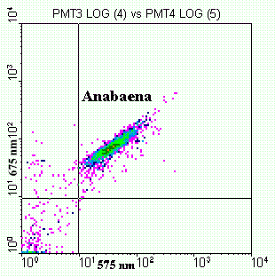 cytometer. The mixture included long filaments of Nostoc and Anabaena. Fluorescence resulting from excitation