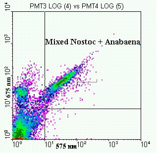 The autofluorescence of a mixture of two cyanobacteria was analyzed using the Coulter EPICS ELITE flow