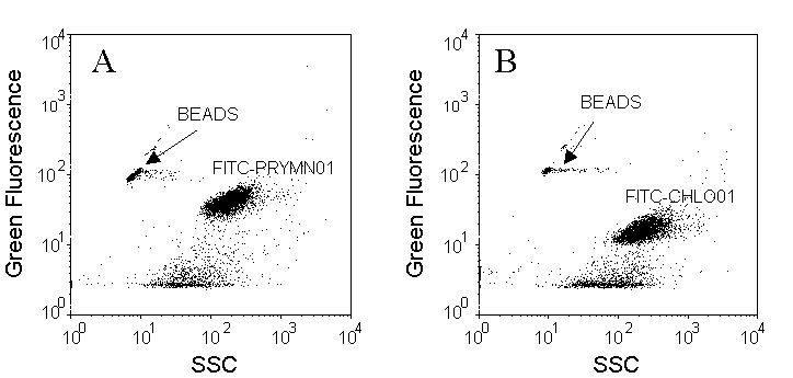 Cells are discriminated on SSC versus green fluorescence (FITC) cytograms. Pleurochrysis carterae (Prymnesiophyceae) has been chosen as an example (A and B) for in situ hybridization with a probe specific for the Non-chlorophyte (FITC-PRYMN01, A) and as a control, with a probe specific for the Chlorophytes (FITC-CHLO01, B) that should not label these cells. Fluorescent microspheres (0.95 µm beads) were added as internal reference.