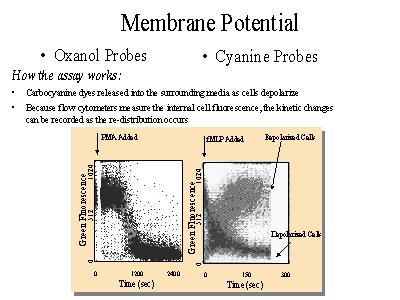 This is an example of a membrane potential assay where neutrophils were loaded with a cyanine probe and stimulated with PMA (left)or fMLP (right). Interestingly on the right, the cells were also 24 hours old and it is apparent that while normally when activated by fMLP, nearly all the neutrophils will repolarize within a few minutes. However, because these cells are 24 hours old, they fail to repolarize indicating a loss of functional integrity. This is despite the fact that these cells appear to produce normal amounts of respiratory burst and also appear to phagocytose normally. Clearly, the membrane potential is one of the earlier functions to suffer from “old age”!!
