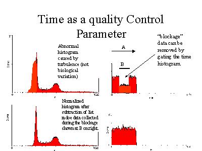 Time was first proposed as a quality control parameter by Watson. IN the above example the DNA histogram (Top left) appears to have an abnormal G0-G1 population. By collecting time as a parameter, an observation can be made as to the rate of cell collection. As can be seen at the right of this histogram, the collection rate appears to have been significantly reduced at region B. This may have been caused by a blockage in the flow cell or some other non-biological problem. If this caused turbulence in the flow cell, a significant impact might be seen on the CV of the fluorescence histogram. By removing the data collected during the time gate B (by using a Boolean operator [a NOT B], only data collected at the appropriate rate is included in the data analysis as seen on the lower left histogram. A normal time histogram is shown on the lower right.