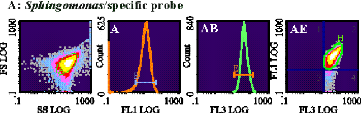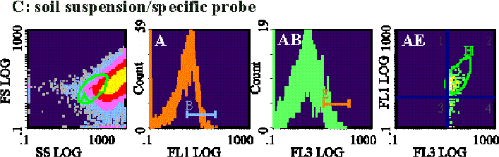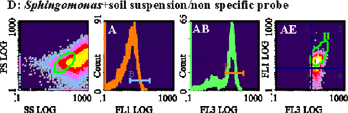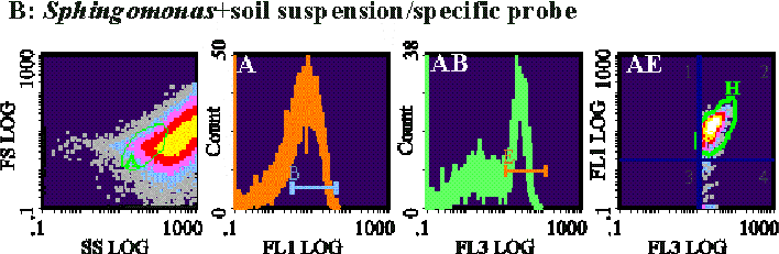 Bacteria were extracted from soil, permeabiliized and hybridized with fluorescein-labelled specific or non-specific probes. The acquisition regions were defined by FCM analysis of pure fluorescent Sphinomonas sp. 107 cells hybridized with the specific probe (A). First, the scattered region was delimited (region A) and its green fluorescence measured by the FL1 detector (region b). Second, among green fluorescent events which have been detected, red EtBr fluorescent bacteria were discriminated using the FL3 detector (region E). Finally, bacteria stained by both fluorescein labelled oligonucleotide and EtBr were quantified (region H).
