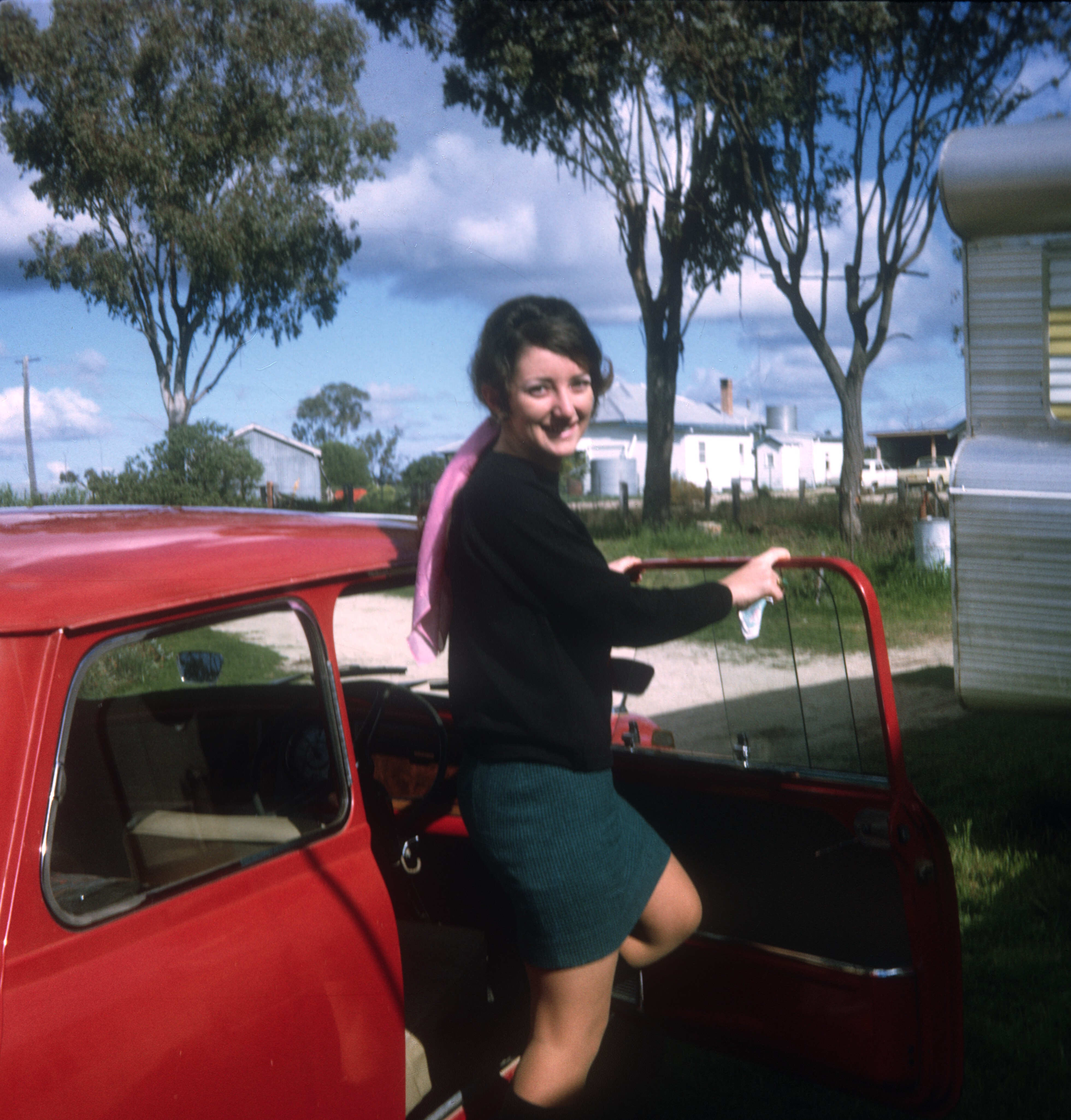 Helen back from college in her red mini minor at Ashford vicarage.jpg