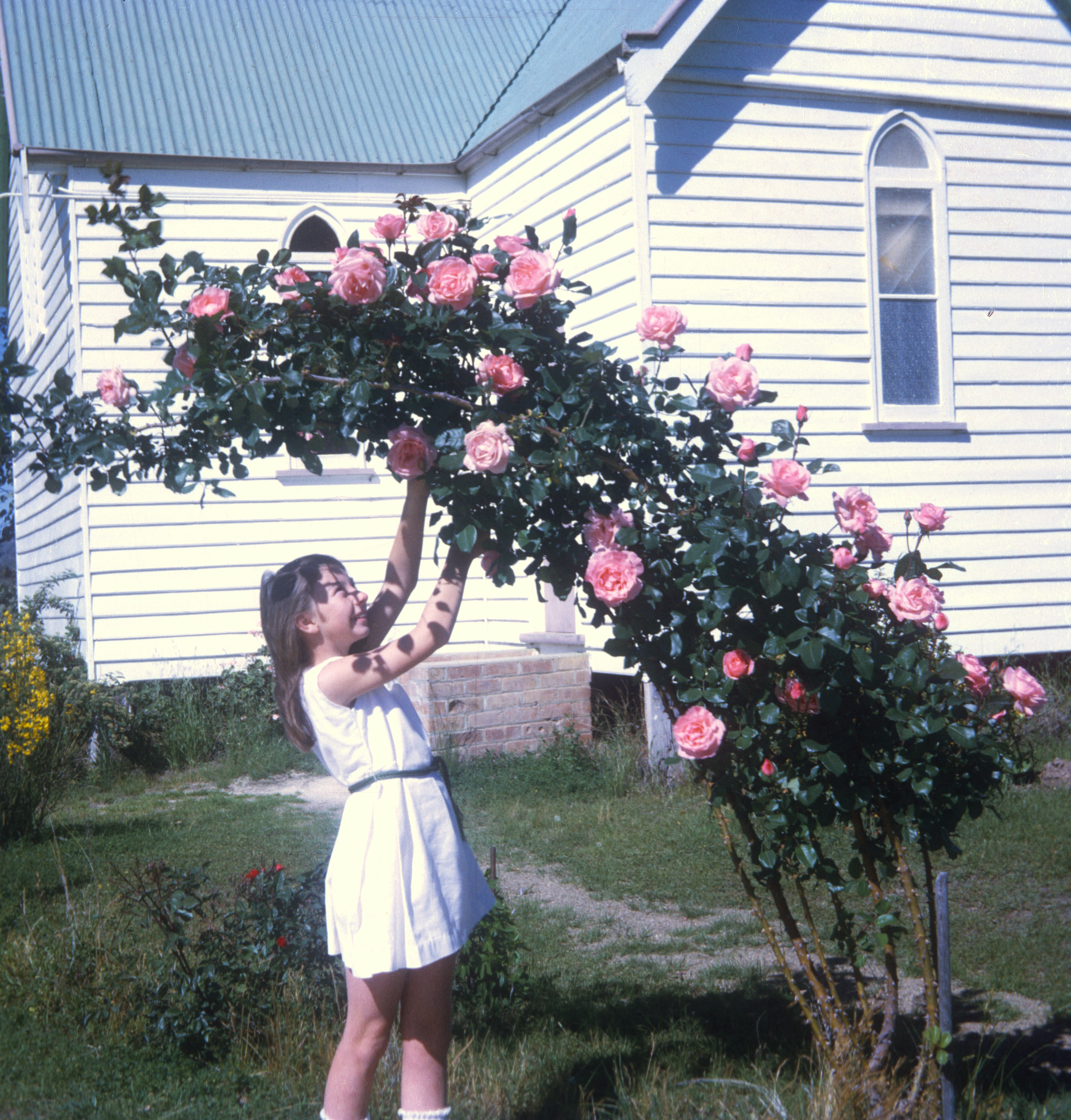 Naomi at St. Marks Anglican Ch Ashford 1971 with one of Dad rose bushes.jpg