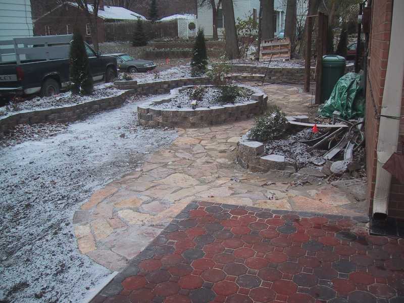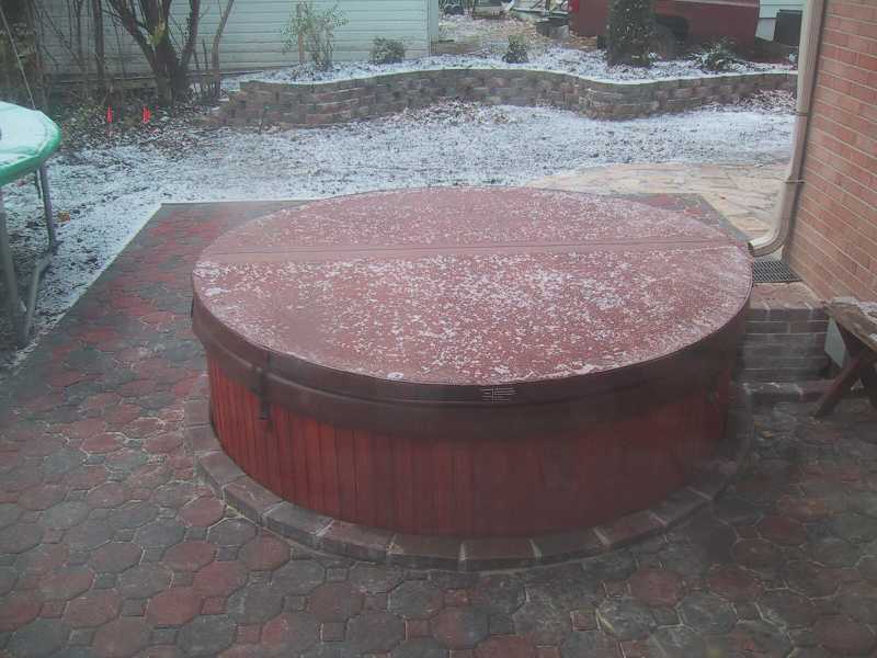 This is the beginning of the Hottub area - it is just outside the kitchen - there was a tree here - I moved it and then dug a hole! (filled it with water!)...sorry Dale - had to do a lot of drain work and put in the foundation for the tub, then had to build around the tub and finally pave. Got this finished in Nov 2002 just as the snow started.....